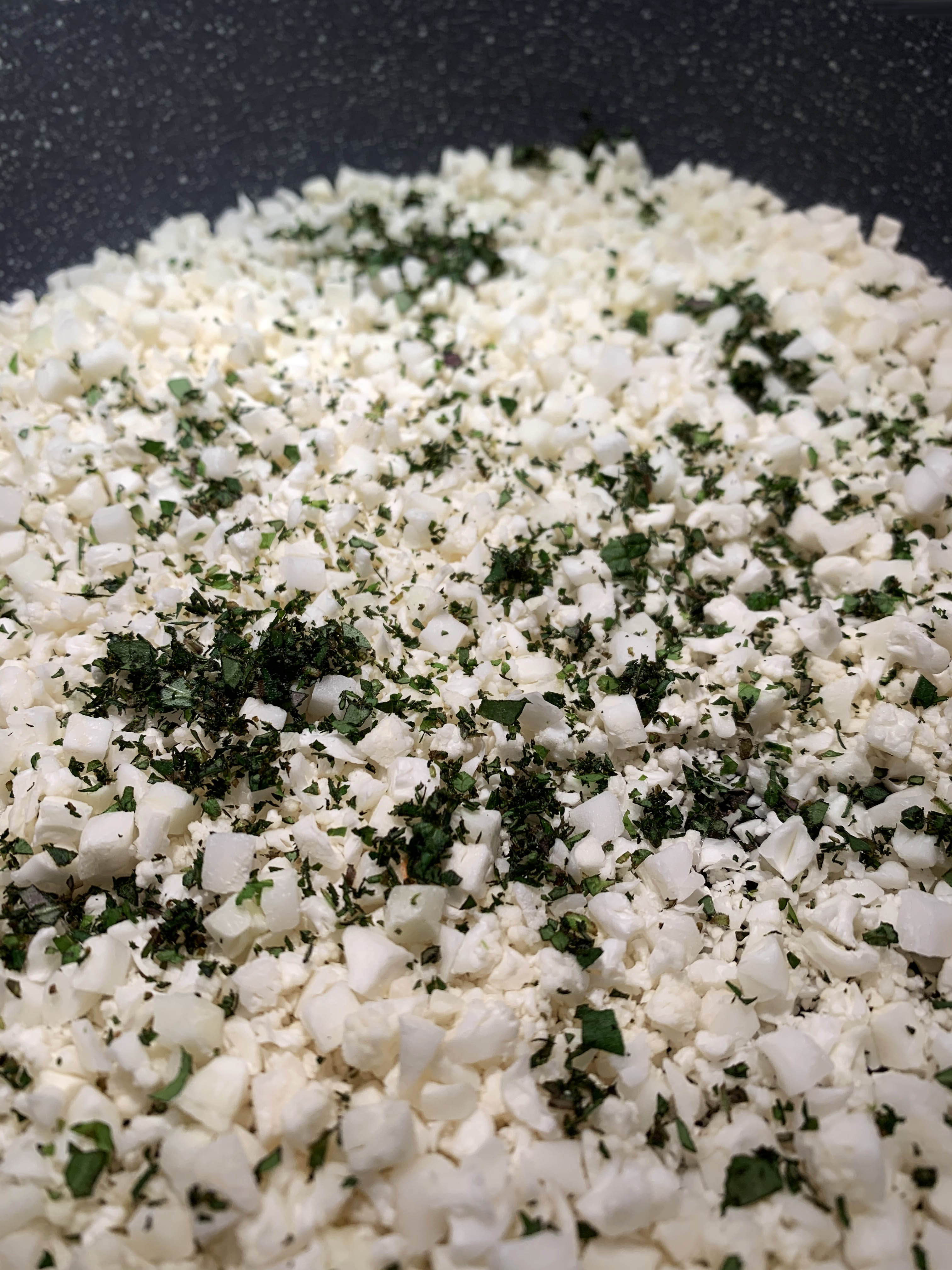 Når kjøttstykkene er ferdig stekt deles de opp i litt tykke strimler. De kan serveres slik som her, med yoghurtdressing, blomkålris, melon, squash og salat. Det er alltid godt å steke blomkålrisen med de samme urtene som brukes ellers. Og blomkålris er jo en ypperlig erstatter for vanlig hvit ris.