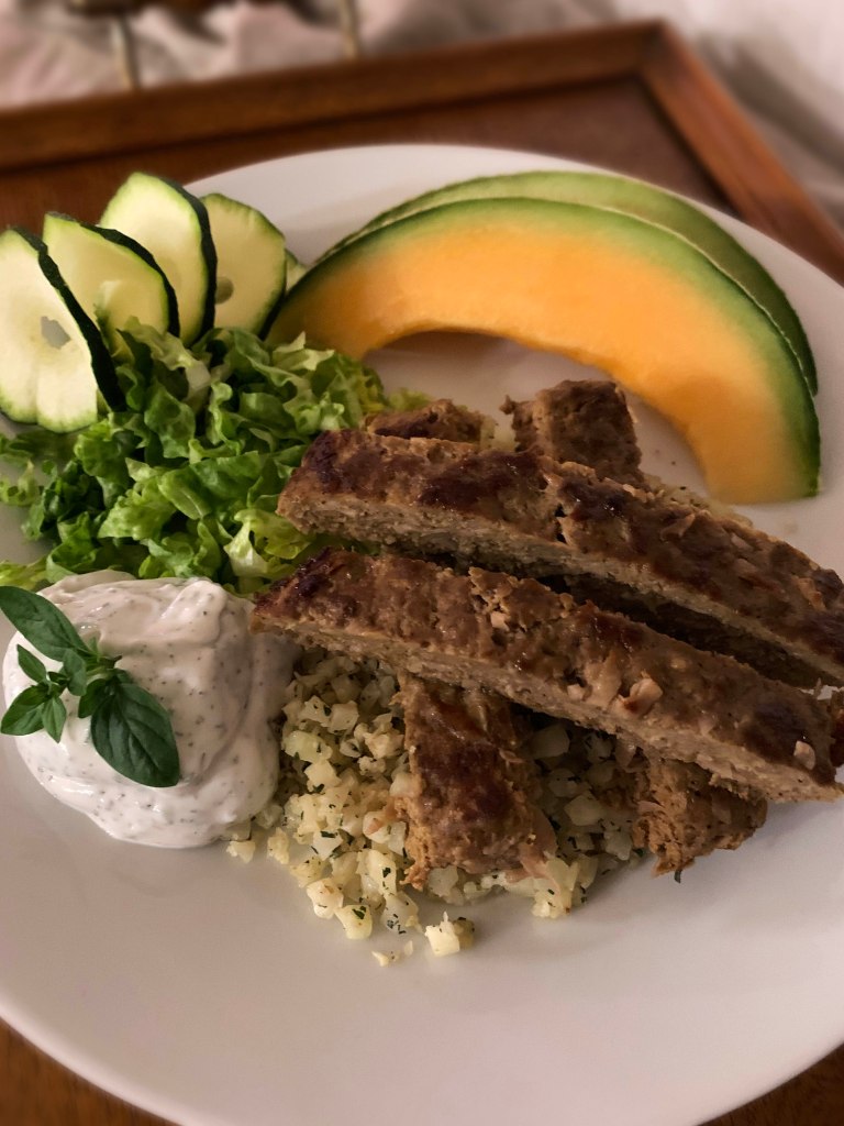 When the pieces of meat are done cooking, they are divided into slightly thick strips. They can be served like I did, with yogurt dressing, cauliflower rice, melon, squash and salad. It is always a good idea to fry the cauliflower rice with the same herbs that are used otherwise.