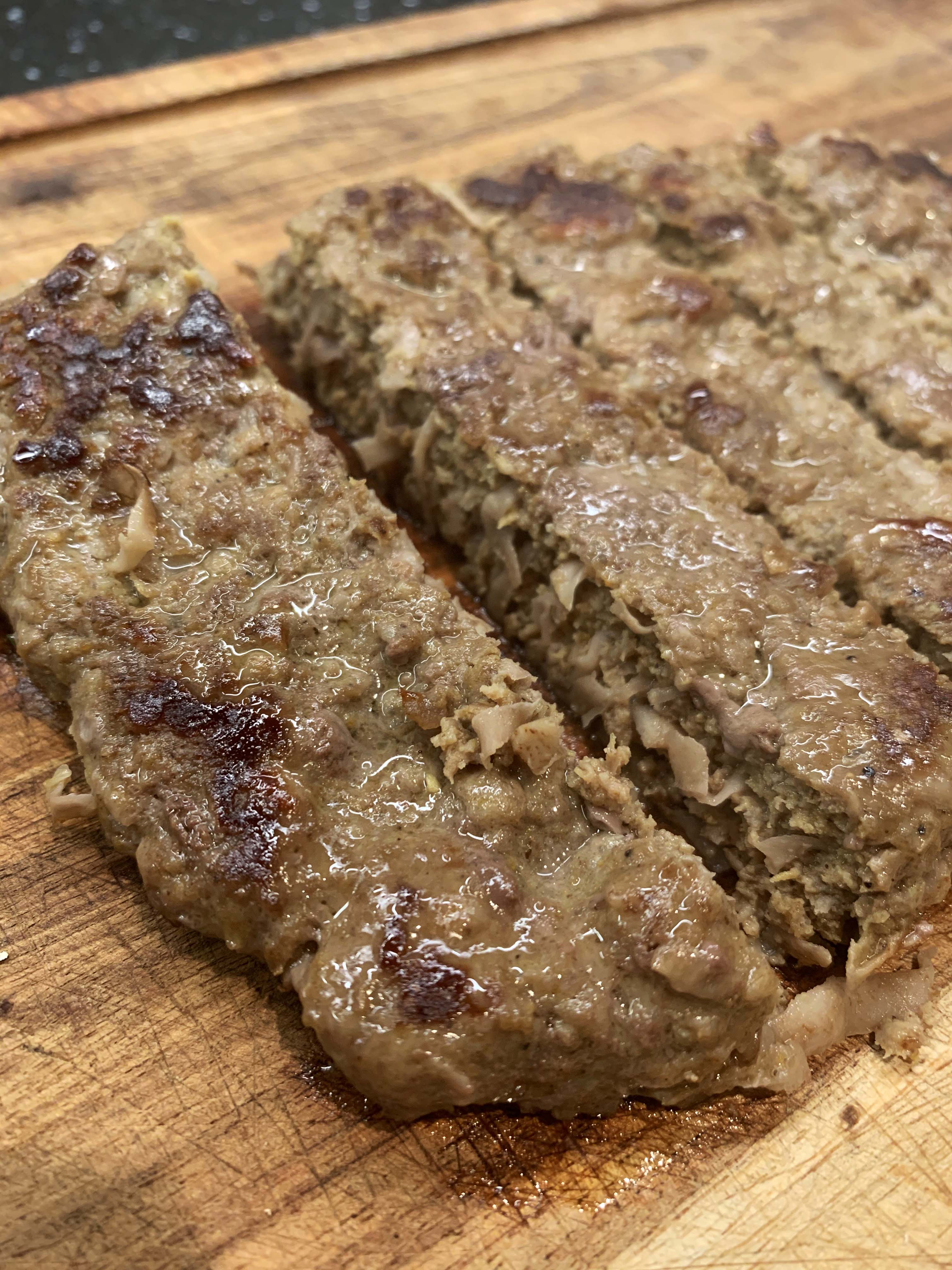 Riv ca 100 gram sellerirot og bland så alle ingrediensene sammen. La det kjøre en stund i mikseren, så det får noe temperatur. Det gjør at kjøttet binder bedre. Jeg lar det kjøre kanskje maks 5 minutter. Kjøttblandingen kan med fordel hvile litt i kjøleskap før steking. Her skal kjøttblandingen fordeles på kald takke. Se bildet over. Jeg delte det i to deler, slik at det er lettere å snu stykkene. Stykkene er allikevel store nok til at det blir pene strimler. Det er lurt å pensle takken med olje først. Det går også fint å bruke vanlig stekepanne. Men fordelen med å bruke takke er at man får stekt større mengder om gangen. Kjekt hvis man er en stor familie!