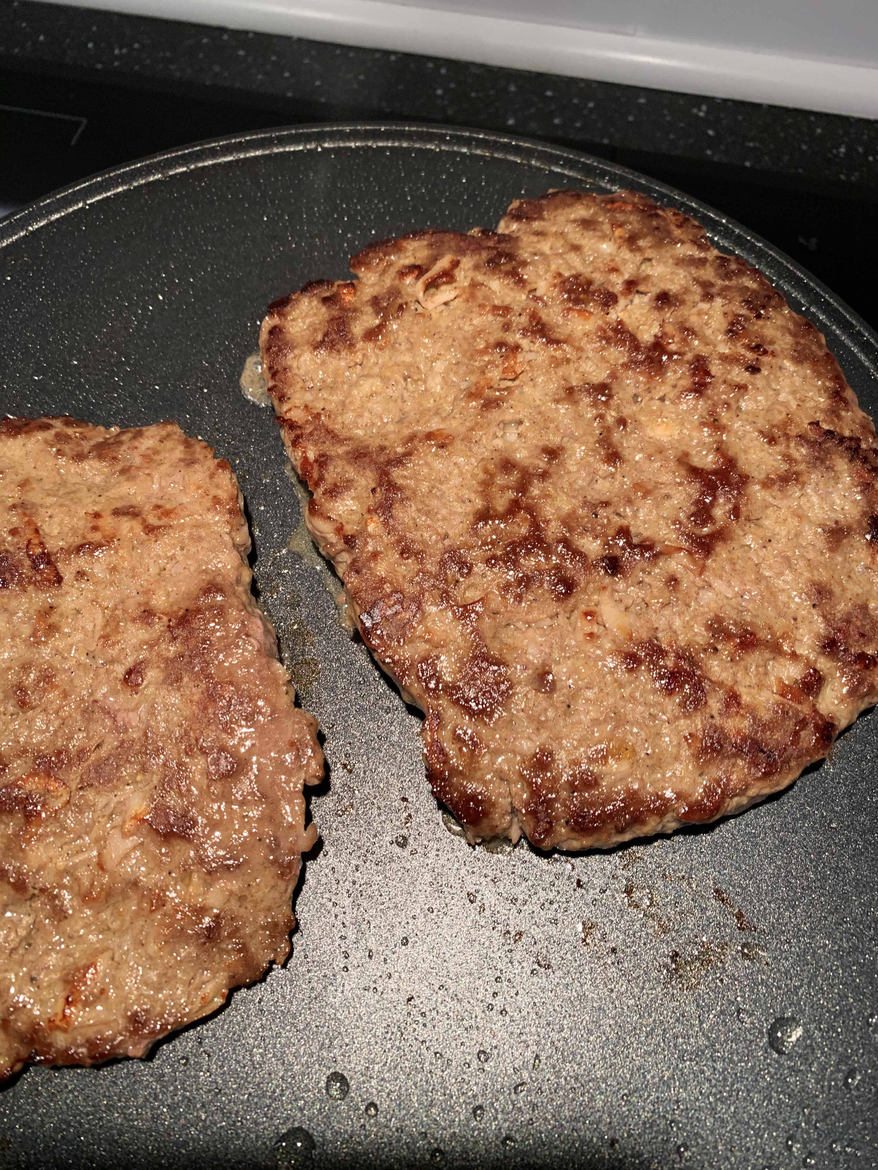 Grate about 100 grams of celery root and then mix all the ingredients together. Let it run for a while in the mixer, so it gets some temperature. This makes the meat better. I let it run for a maximum of 5 minutes. The meat mixture can advantageously rest a little in the fridge before frying. Here, the meat mixture should be distributed on your roasting tin when it is still cold. Look at the the picture above. I divided it into two parts, so it is easier to turn the pieces. It is a good idea to use some oil on the tin. You can easily use a regular frying pan if you don’t have a roasting tin 🙂
