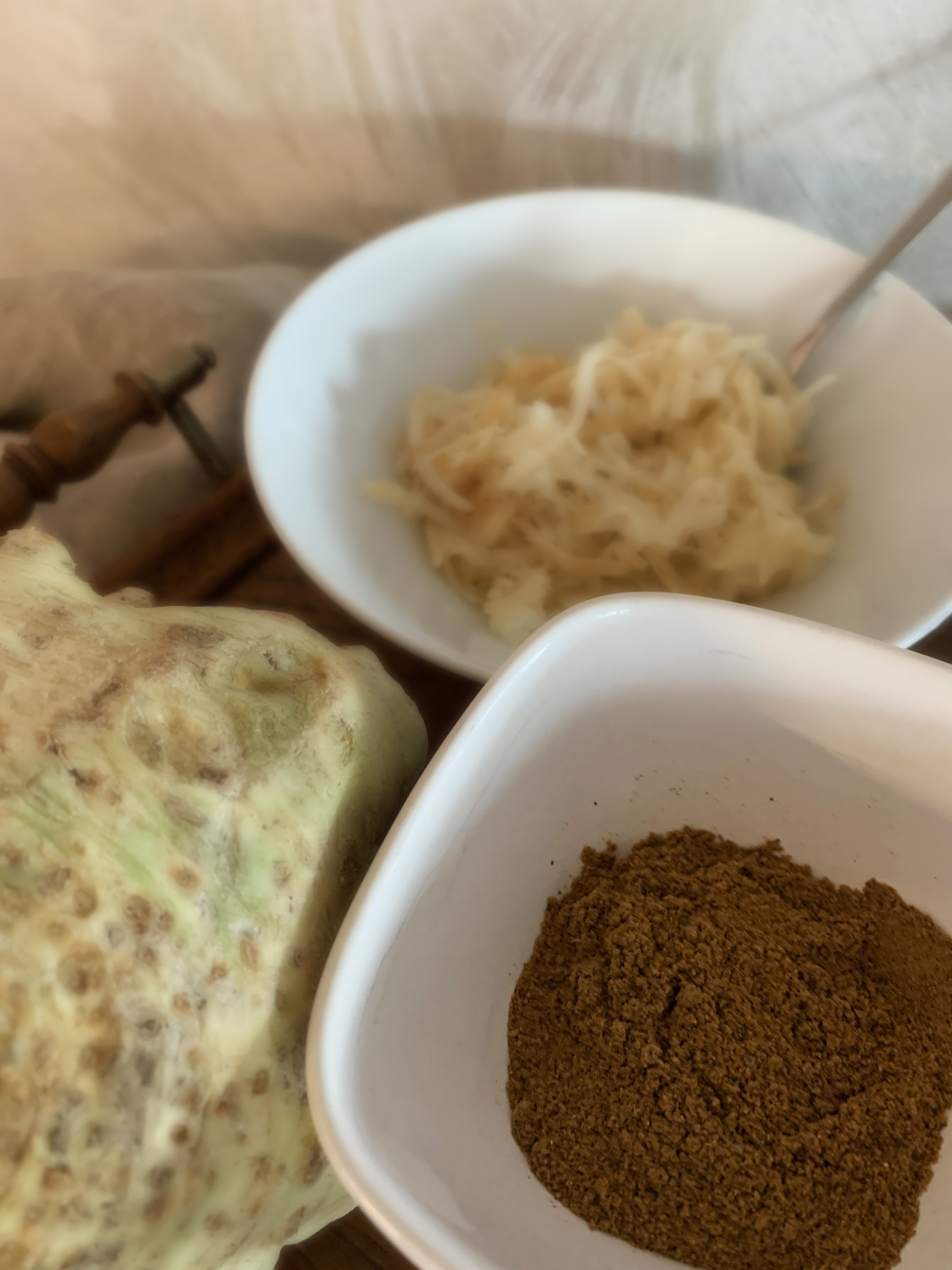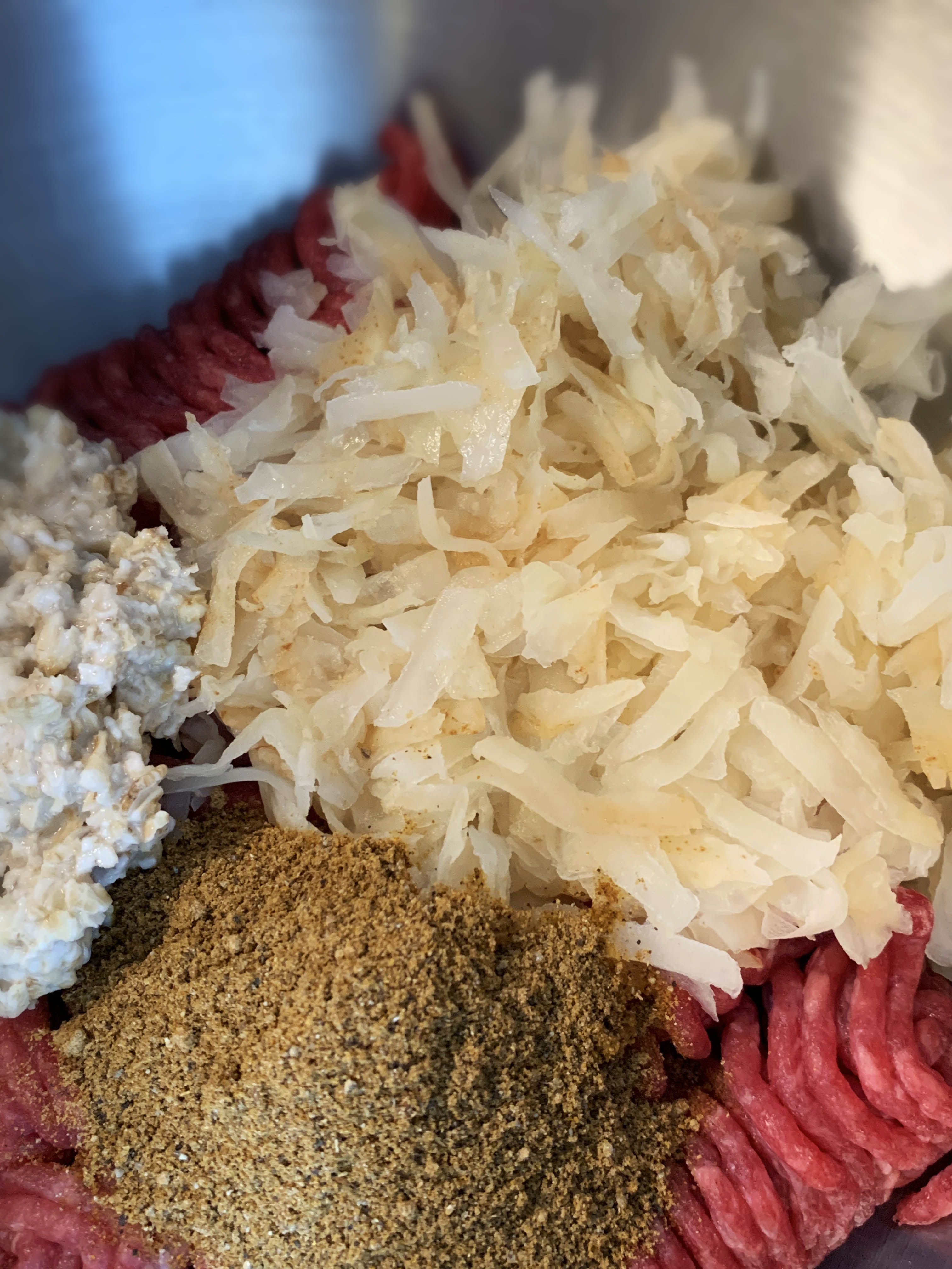 Start med å blande 2 ss havregryn i dobbel mengde vann, så det sveller ferdig før det kommer oppi deigen. Hvis havregrynene ikke får svelle i vann først vil de trekke til seg kraft fra kjøttdeigen, og da er det ikke noe vits i å ha de i. Men havregryn her? Det høres kanskje ikke logisk ut, det er jo mer vanlig å bruke potetmel og andre meltyper for å binde. Men dette er for å få en mer saftig blanding, det sammen med sellerirot gjør at kjøttmiksen ikke blir tørr. Et lite jungeltriks her altså 🙂