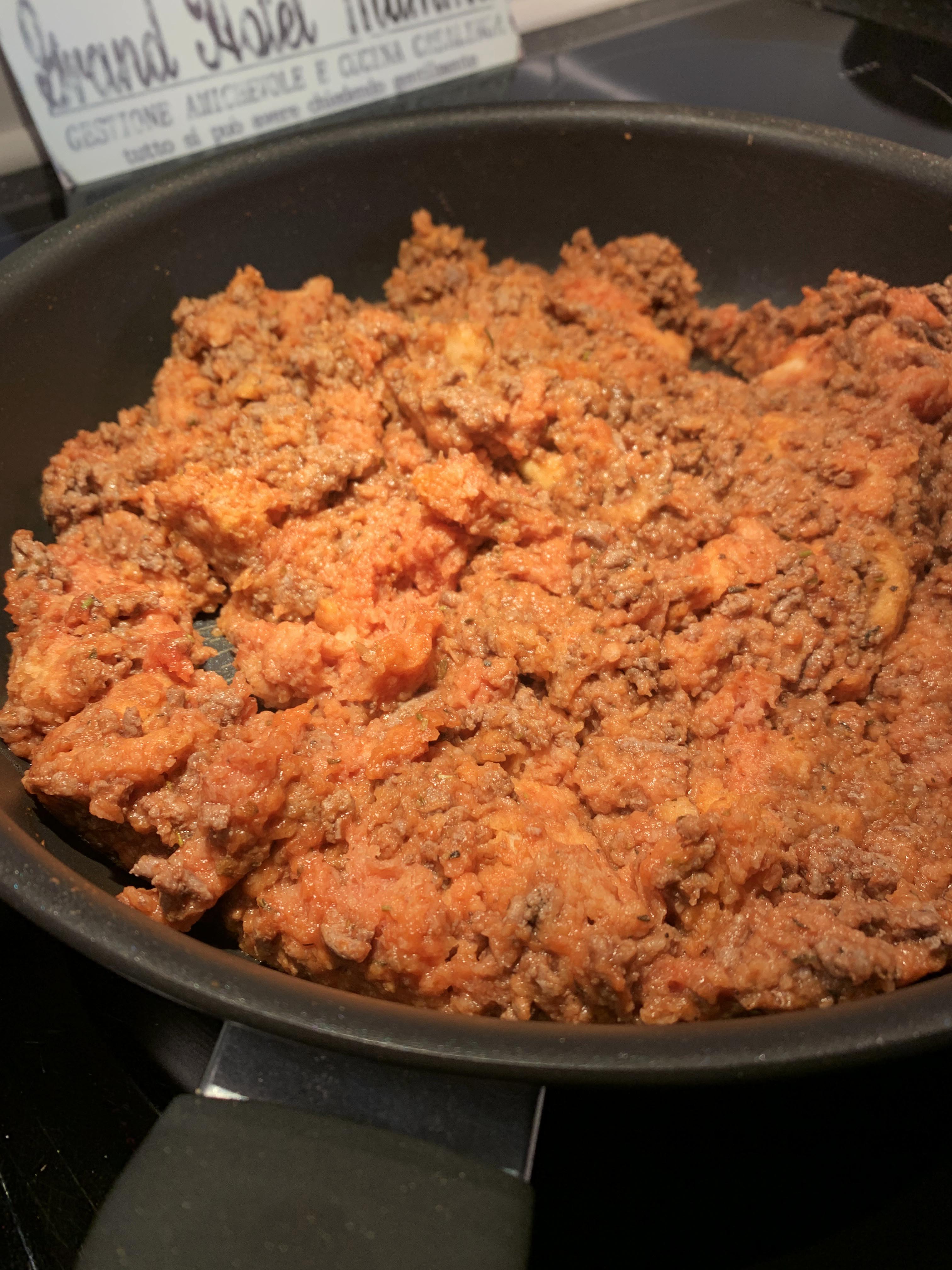 Start by removing the filling inside. Keep enough inside so that the walls do not fall apart when you put the stuffing back in. Fry the minced meat together with your favorite spice. I used approx. 2 tablespoons Provencal spices, 2 teaspoons pepper mixture and 2 teaspoons salt. Mix the mashed tomatoes, balsamic vinegar and the filling from the inside of the white bread into the meat mixture.