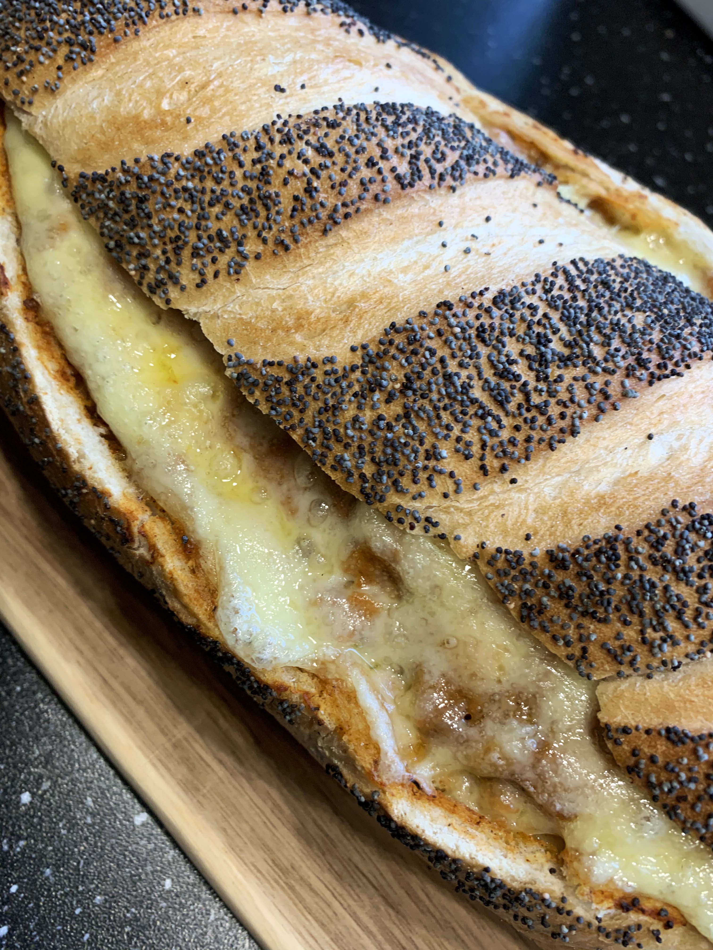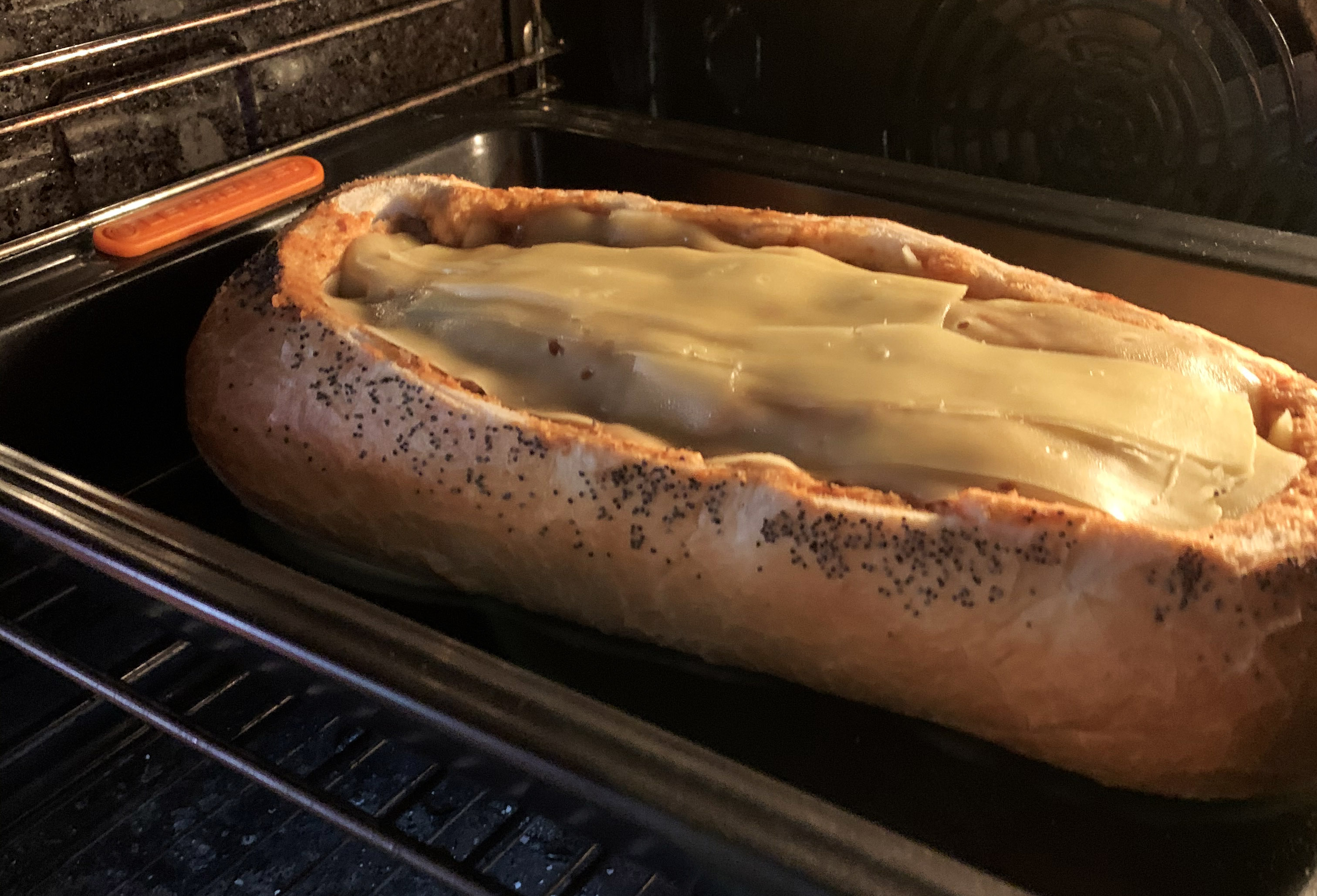 The loaf is baked at about 200 degrees (Celcius) for about 20 minutes, or until the cheese is melted. Put the lid on and bake for anoter 5 – 10 more minutes. Serve with a salad.