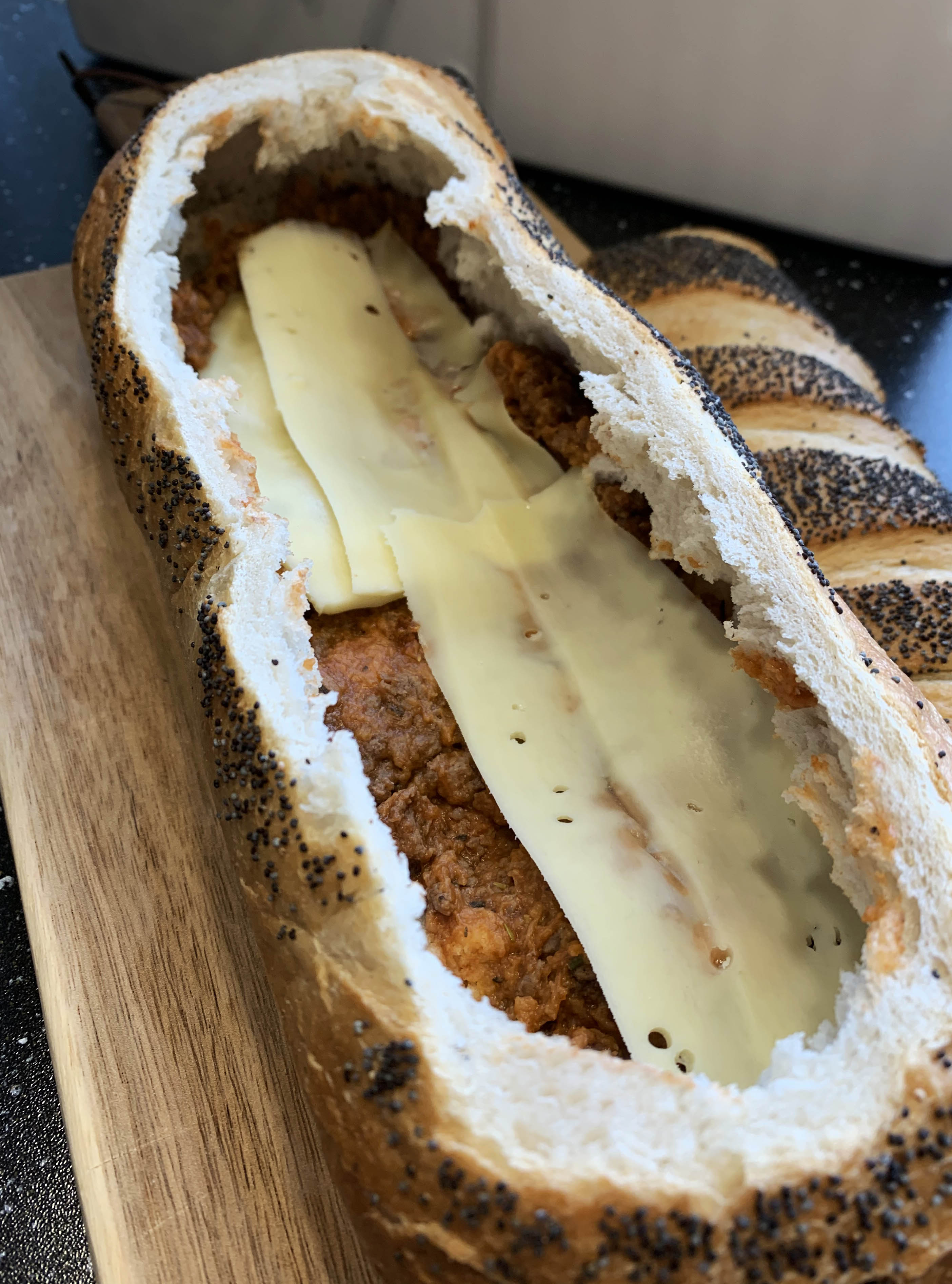 This was just a variation of stuffed white bread. Because as we all know; it is only the imagination that sets the limits for what one can create. The point is to get some sort of stu inside a white bread. The variations can be endless. If you would rather have a vegetarian dish, it is nice to replace the minced meat with eggplant, lentils, mushrooms and onions. Or maybe you replace the minced meat with some slices of chicken? This is what’s so great about recipes! You can make changes and add some new taste. Make it your own new favorite dish!