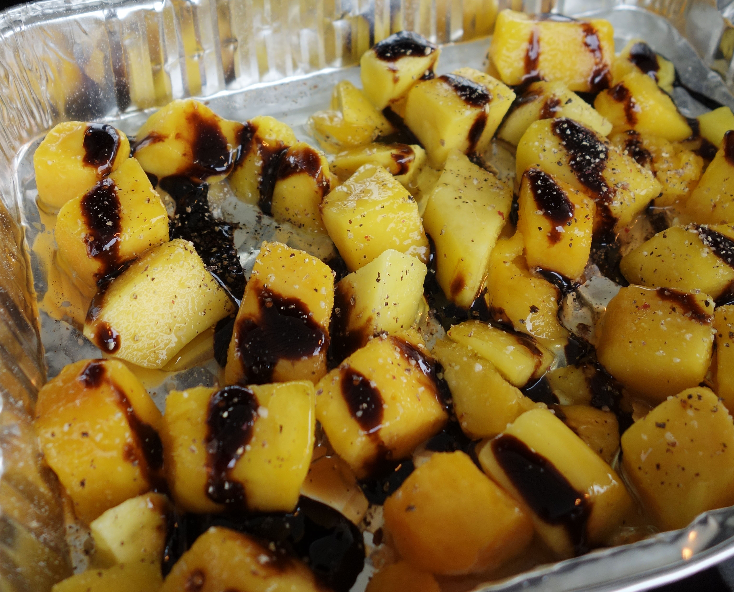 Peel and cut the mango into pieces and place them in an aluminum tray greased with olive oil. Spread balsamic vinegar, brown sugar, salt and pepper over. Let it cook slowly where the heat on the grill is weakest. You will know when you want to eat them 🙂
