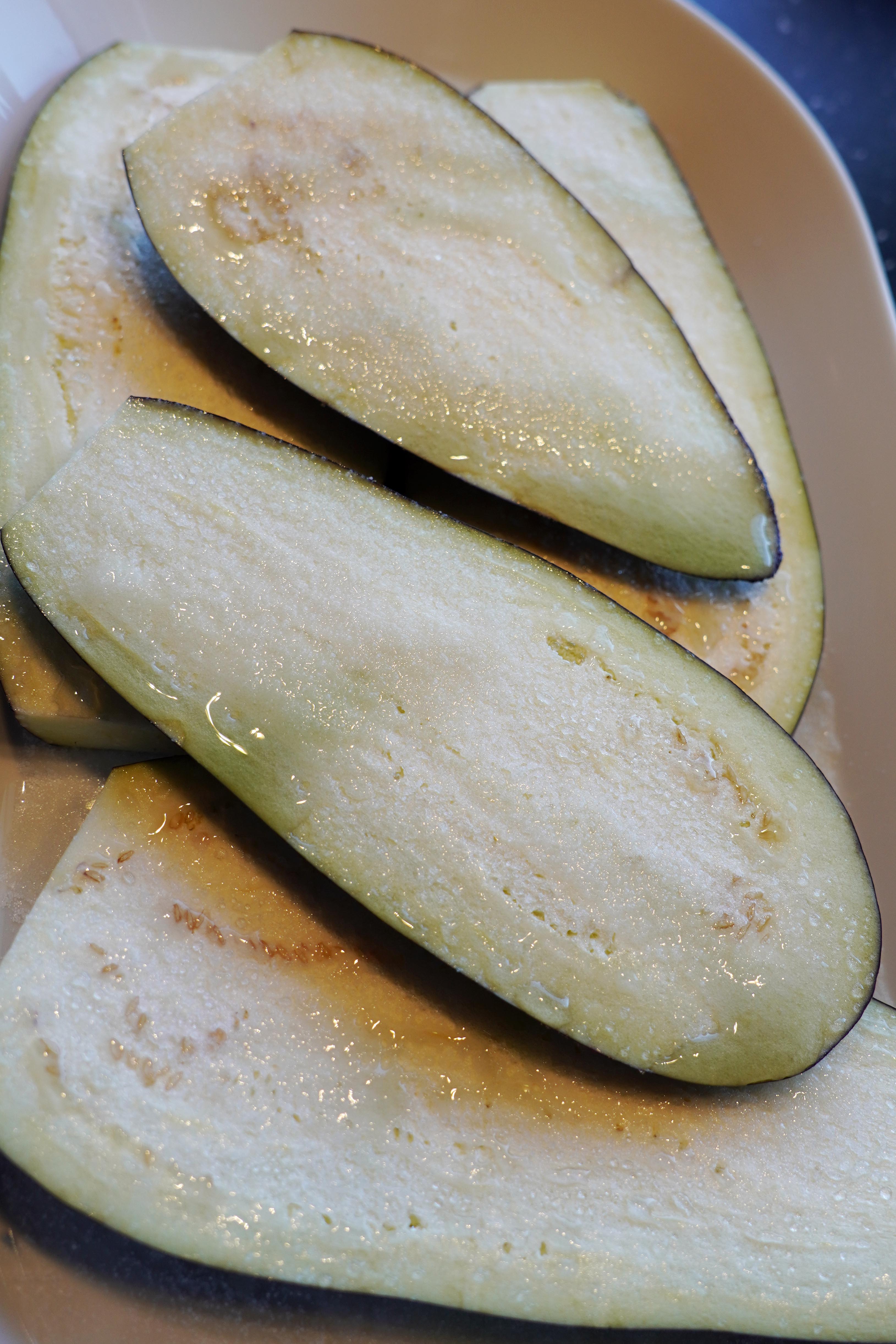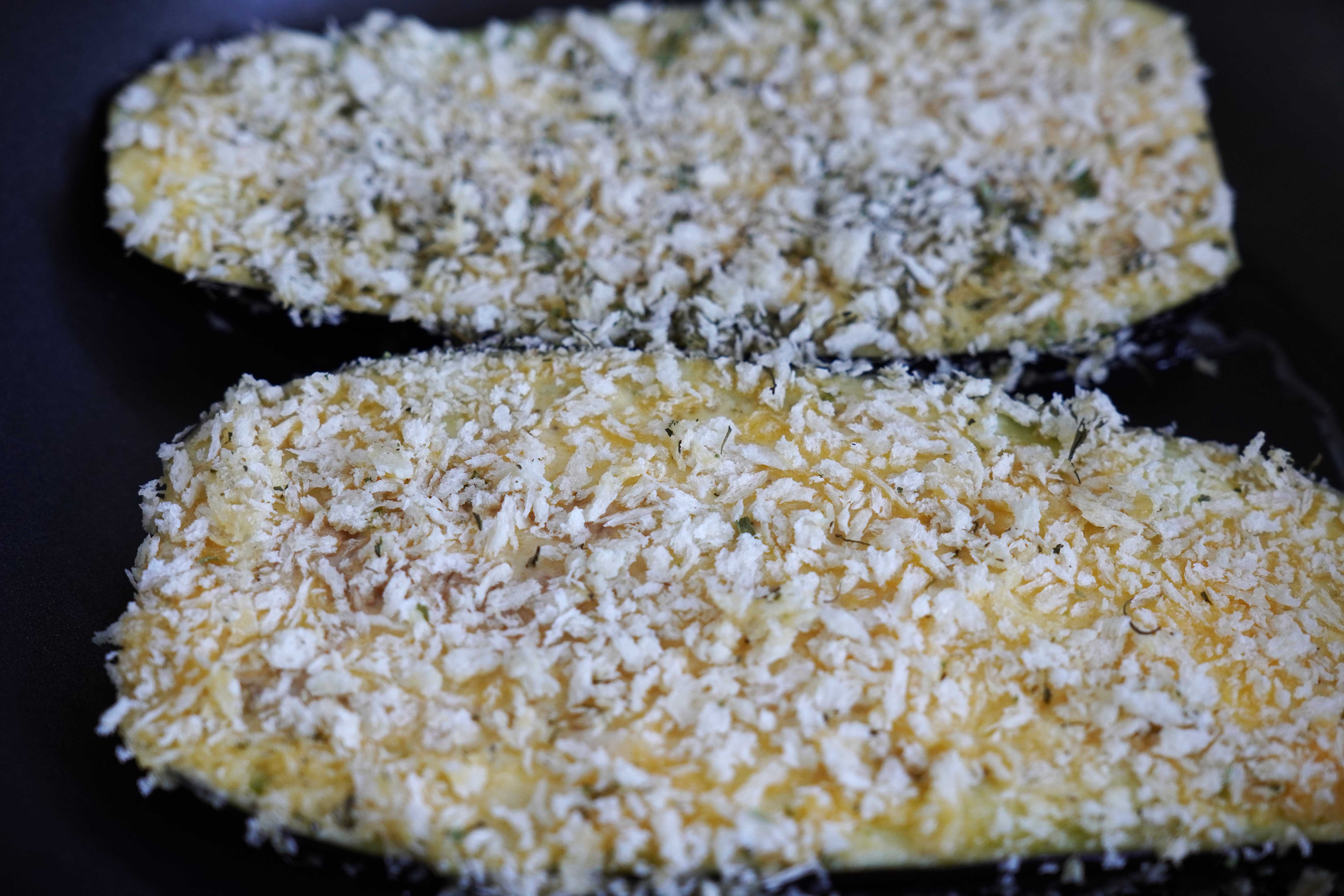 Del en aubergine i skiver, enten avlange eller runde, og ca 1 cm tykke. Salt de godt på begge sider og la de ligge til det pipler væske ut av de. Jeg velger å salte aubergineskivene til denne retten. Det er for å trekke ut den bitre smaken. Skyll godt og tørk. Så vender du skivene i mel. Så innom et fat med sammenvispet egg, før de til slutt dyppes i panko, altså grovt paneringsmel laget av brødsmuler. Jeg bruker også litt tørket bladpersille i panko-blandingen for litt ekstra smak. Salt og pepper drysses over under steking. Stekes i olivenolje til de er myke inni og sprø på utsiden. Det går med en god del olivenolje! Men du verden så godt det smaker 😉