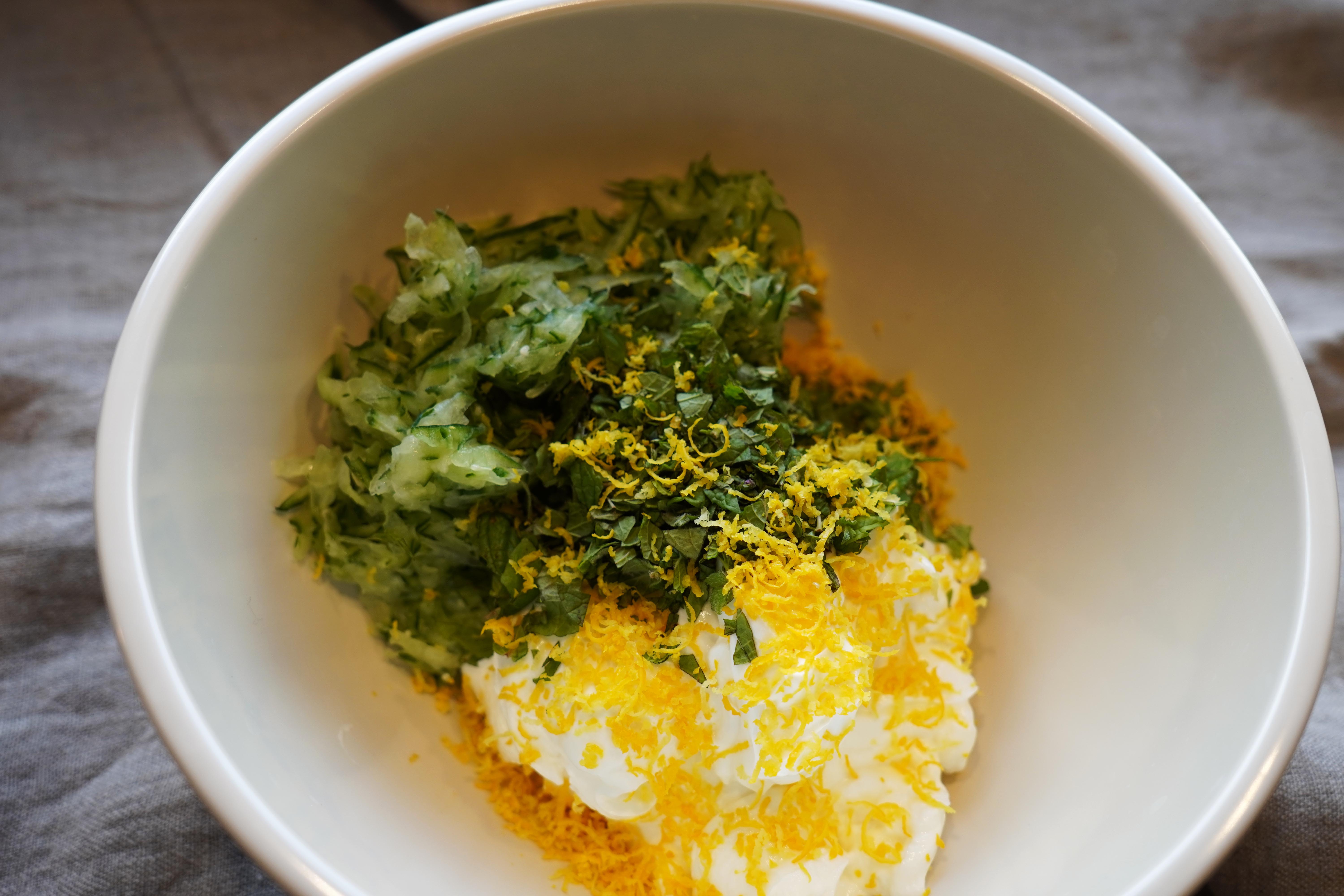 Start by grating the cucumber on a grater. Put the cucumber mass in a cloth and squeeze out as much juice as possible. ‘Shake’ the pine nuts in a dry frying pan. Mix yogurt, cucumber mass, chopped mint, chopped garlic and lemon well together. Season with sugar, salt and pepper. Add a little olive oil at the end. The consistency should be like Tzatziki. Just before serving, mix in the roasted pine nuts. The nutty taste from the pine nuts will make the cucumber salad extra tempting and add a nice flavouring taste.