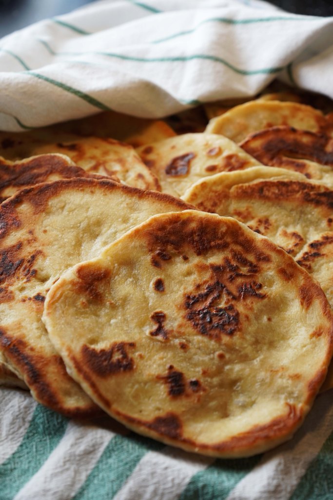 Divide the dough into 12 pieces, roll out into round loaves about 3 mm thick. Fry in a frying pan or grill pan for about 2-3 minutes on each side. Use medium heat. The loaves should bubble up a little, and fry until they are nice and golden on each side. Use olive oil while frying! Place in stack under cloth so they stay juicy.