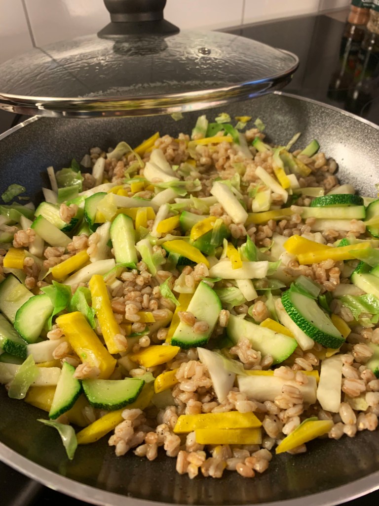 Start med å kutte opp alle ingrediensene i passe store biter. Ha olivenolje i stekepannen, og stek speltperlene lett. Ha i resten av ingrediensene etter hvor lenge de skal stå for å bli myke. Her er det først gule beter, nepe, spisskål og til sist squash. La det surre litt under lokk på svak varme. Fordel spelt og grønnsaker ut til sidene, slik at det blir en sirkel i midten av stekepannen. Hell i 1 ss sesamolje, og 2 stk sammenvispede egg. Dra så inn litt og litt av speltgrønnsakene i eggeblandingen til det er mikset sammen. Smak til med salt og pepper. Det går fint å bruke rester av ris i stedet for speltperler.