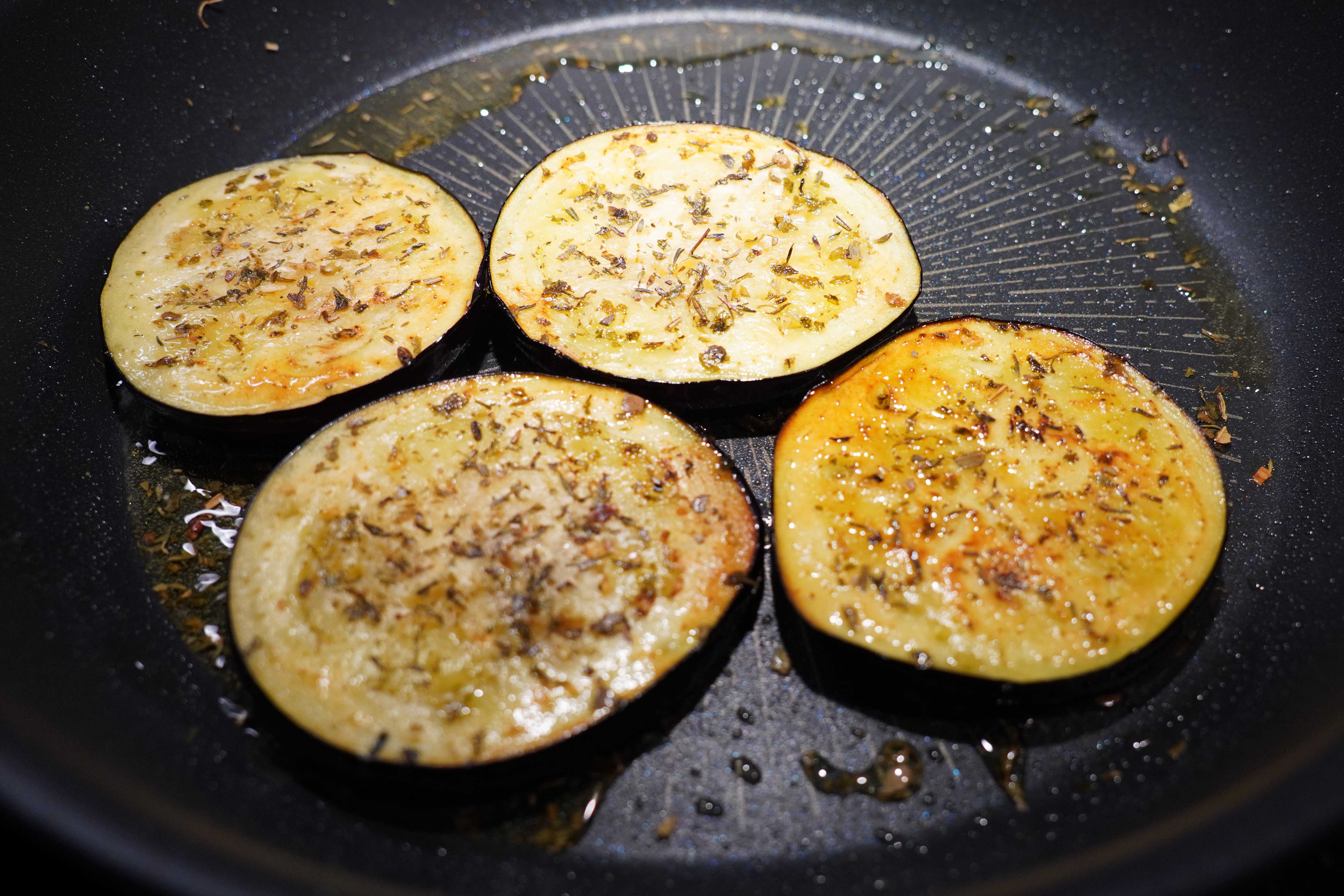 Auberginen deles i skiver på ca 1 cm tykkelse. Her er de stekt i olivenolje og med ulike tørkede krydder som basilikum, timian, sar, oregano og rosmarin. Typiske urter fra middelhavslandene sammen med salt og pepper, minner smaksløkene om varme sommerdager.