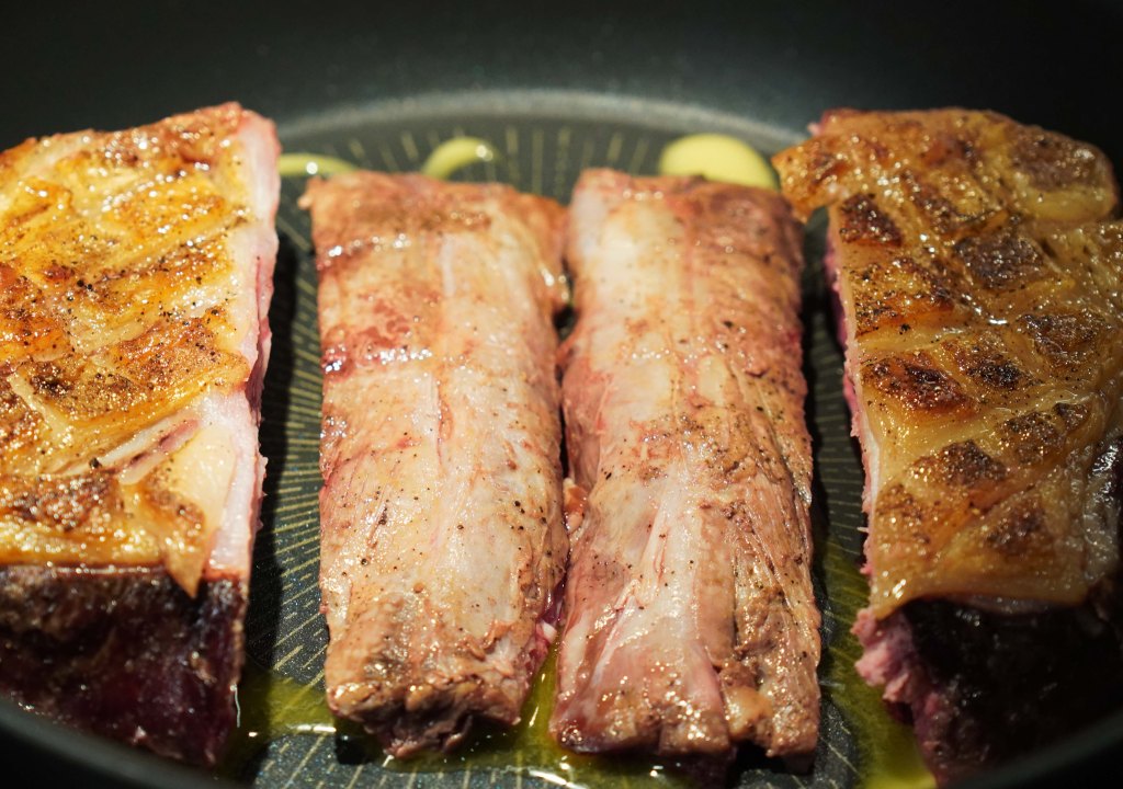 A nice piece of meat needs to acclimatize to room temperature before frying. The lamb meat also has some lard, which can give a little too much flavor, tasting like an old sheep, if not removed. So remove the lard, and keep the fat layer on top, we need it to melt into the meat and make it juicy! A little inspired by the Christmas ribs, I checkered the meat before massaging in salt and pepper. Then it was time to fry the lamb in the frying pan, so it got a nice, crispy crust, before it all went into the oven and properly settle there on a bed of celery sticks for the next 5-6 hours. The oven is preheated to 220°C, and when the meat is inserted, I turn down to 60°C. Then the meat can basically be left there for many hours without supervision. If you are afraid it will be a little dry, it can be brushed with a little oil or butter along the way.
