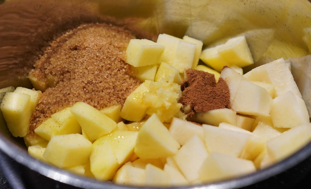 Cut the fruit into pieces and mix everything together, except the pine nuts, in a saucepan. Let it simmer on the plate until it is tender and it can be mashed. I do not use a hand mixer here. Instead, use a fork or an old-fashioned masher for mashing potatoes. It is nice to taste some of the pieces of fruit. Be aware that apple cider vinegar can smell strong, but it will turn out just fine and tastes great when done!