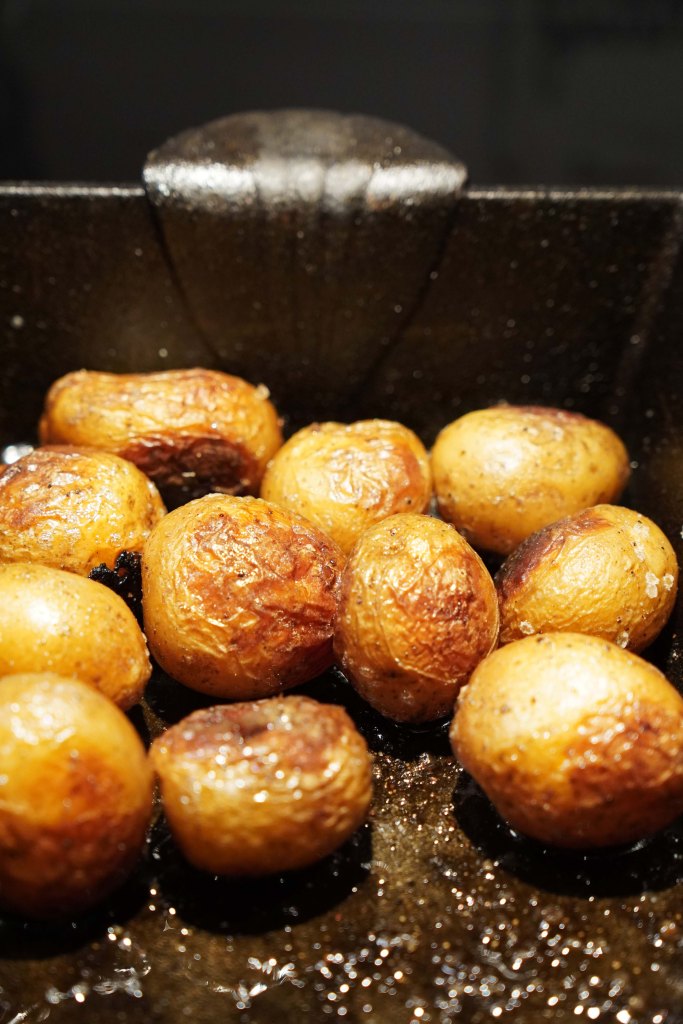 Poteter er et tilbehør mange liker. I år har vi funnet disse små, skjønne potetene som kalles morenepoteter. De er norske og er helt geniale å ha i en jernform i ovnen. De bør freses litt på plata før de kommer i ovnen, Vi har en liten jernform, og den kan brukes både på induksjonstopp og i ovnen. Smørstekte med et godt dryss havsalt over! Helt supert, sier kjæresten!