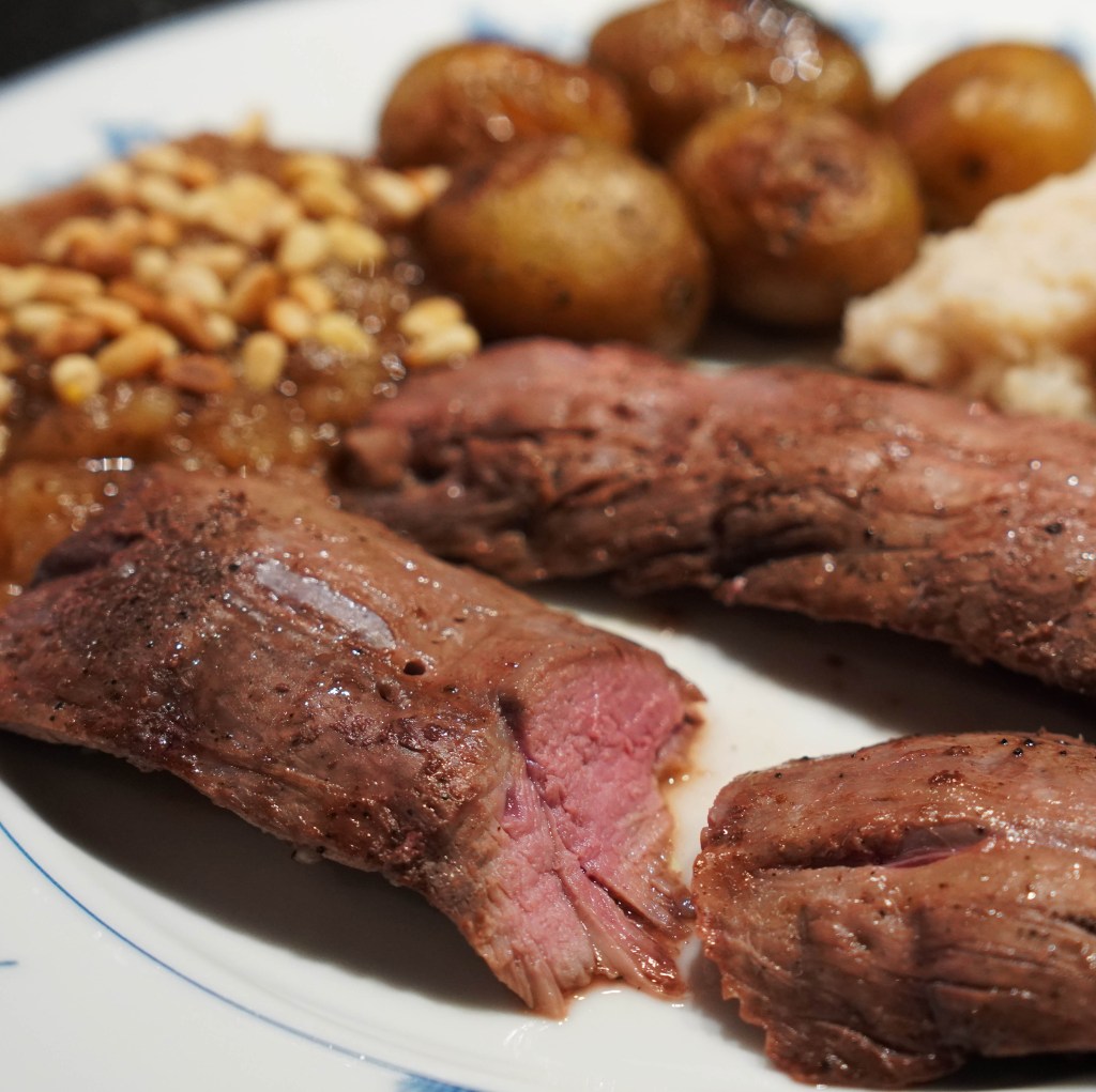 Lammesadel består jo av både indrefilet og ytfrefilet. Når den stekes hel på denne måten, så smelter fettlaget på toppen ned i ytrefileten, og beinet gjør at også indrefileten får ekstra smak. Når den i tillegg ligger på en seng av sellerirot, får den også litt smak fra rotfrukten. Når kjøttet når sine 62 grader, tar jeg det ut og lar det hvile 5-10 minutter. Så løsner jeg indrefileten og ytrefileten fra beinet ved å la en skarp kniv løpe langs beinet. Da får vi 4 kjøttstykker. Finn frem stekepanna, og fres kjøttstykkene på innsiden, kun kort tid, og rett før servering!